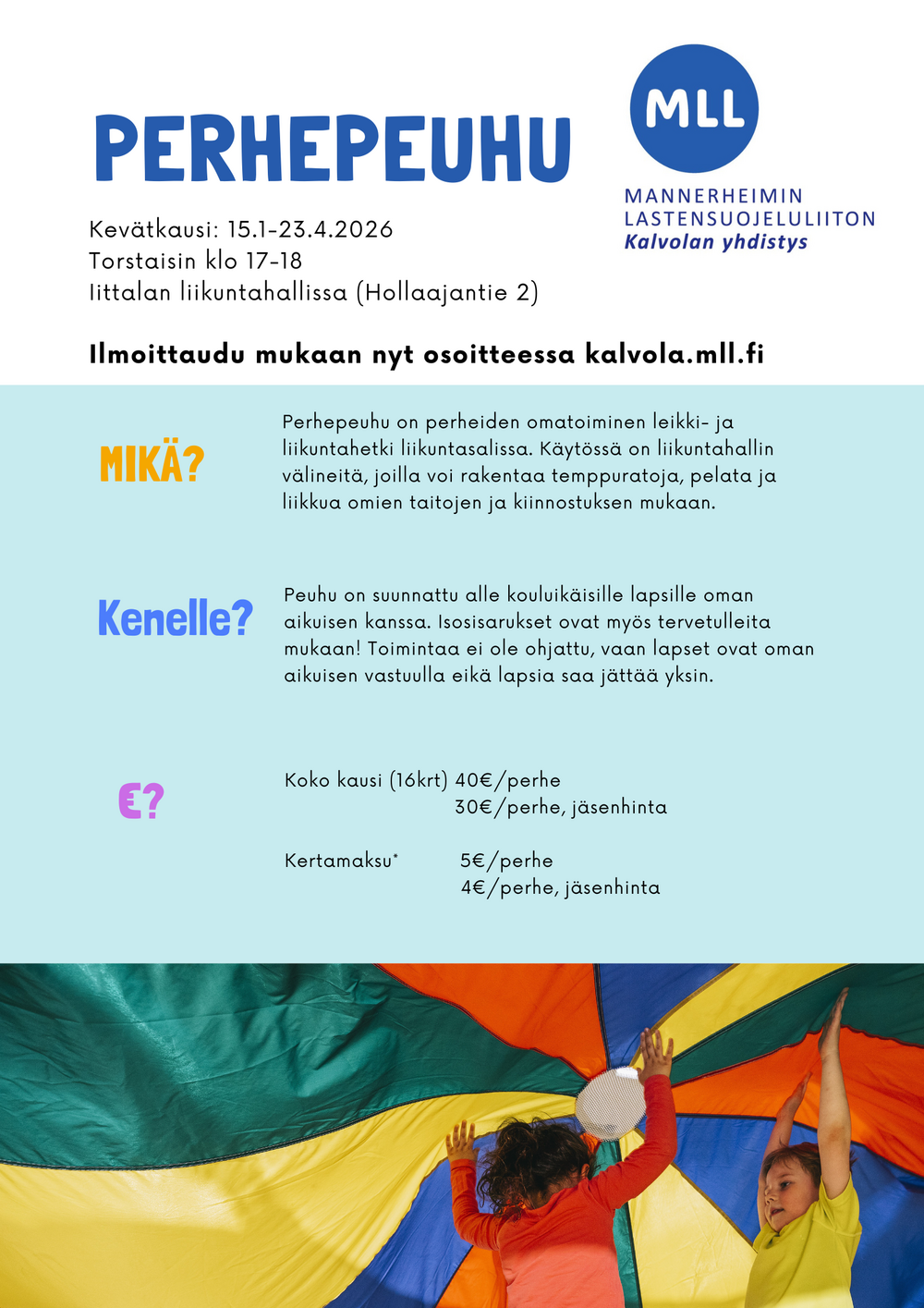 Perhepeuhu järjestetään torstaisin klo 17-18, Iittalan liikuntahallissa (Hollaajantie 2). Liikuntahallin edessä on hyvin parkkitilaa. Syyskauden viimeinen perhepeuhu kerta